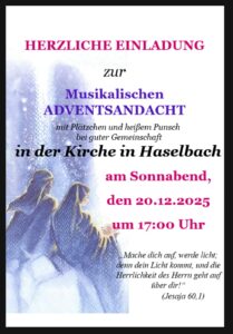 Herzliche Einladung: Musikalische Adventsandacht in Haselbach Posted by Miriam Sparbrod View all posts by Miriam Sparbrod